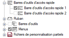 - Dans le volet Personnalisations dans <nom de fichier>, cliquez sur le signe Plus (+) en regard du noeud Barres d'outils d'accès rapide pour le développer.