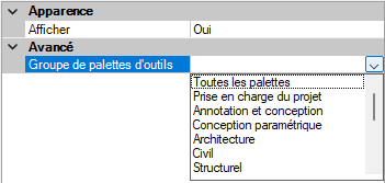 - Dans la zone Groupe de palettes d'outils, sélectionnez l'un des groupes de palettes d'outils répertoriés pour l'associer à l'onglet de ruban.