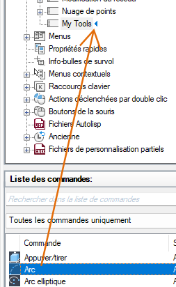 - Dans le volet Liste des commandes, faites glisser la commande que vous voulez ajouter jusqu'à la barre d'outils de votre choix dans le volet Personnalisations dans <nom de fichier>.