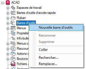 Une nouvelle barre d'outils (nommée Barre d'outils1) est placée au bas de l'arborescence des barres d'outils.