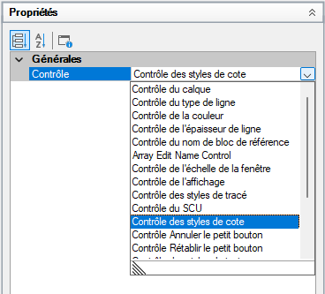 - Dans le volet Propriétés, dans la zone Contrôle, cliquez sur une flèche pour afficher la liste des contrôles de barre d'outils disponibles.