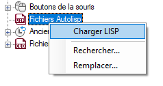 Dans le volet Personnalisations dans <nom de fichier> de l'onglet Personnaliser, cliquez avec le bouton droit de la souris sur le nœud Fichiers LISP. Cliquez sur Charger LISP.