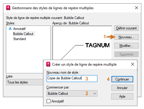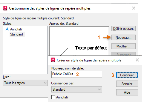 Dans le Gestionnaire des styles de lignes de repère multiples, cliquez sur Nouveau (1), saisissez « Bubble Callout » comme nom du nouveau style (2), puis cliquez sur Continuer (3).