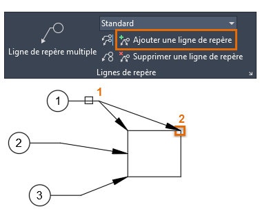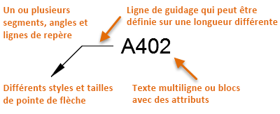 Remarque : La commande LIGNEDEREPMULT comporte des options permettant de modifier l’ordre de saisie de la commande (vous pouvez choisir de spécifier la pointe de flèche, la ligne de guidage ou le contenu en premier).