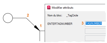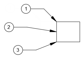 À l’aide de l’accrochage aux objets de type Extrémité, cliquez sur un coin du rectangle pour spécifier l’emplacement de la pointe de flèche (1). Cliquez ensuite sur un emplacement pour définir la ligne de guidage de la ligne de repère (2), saisissez une lettre ou un chiffre dans la boîte de dialogue Modifier les attributs (3), puis cliquez sur OK.