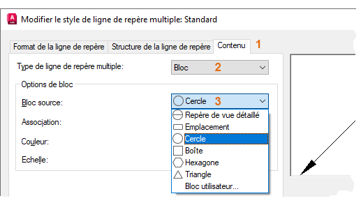 Ensuite, cliquez sur l’onglet Contenu (1), remplacez le type de ligne de repère multiple Textmult par Bloc (2). Pour le bloc source, choisissez Cercle (3). Cliquez ensuite sur OK.