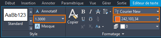 Dans l'onglet contextuel du ruban Éditeur de texte, effectuez les opérations suivantes pour modifier la mise en forme des caractères dans l'objet TextMult :