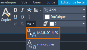 Sur l'onglet contextuel du ruban Éditeur de texte, dans le groupe de fonctions Outils, cliquez sur MAJUSCULE.