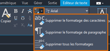 Sur l'onglet contextuel du ruban Éditeur de texte, dans le groupe de fonctions Formatage, cliquez sur Effacer, puis choisissez l'une des options suivantes :