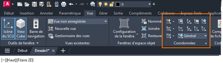 Dans cet exercice, vous allez masquer l'onglet de ruban Paramétrique et afficher le groupe de fonctions Coordonnées dans l'onglet Vue.