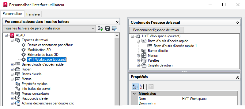 Dans l'éditeur Personnaliser l'interface utilisateur, sous le noeud Espaces de travail, sélectionnez l'espace de travail à modifier. Modifiez ensuite les paramètres dans les volets Contenu de l'espace de travail et Propriétés.