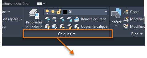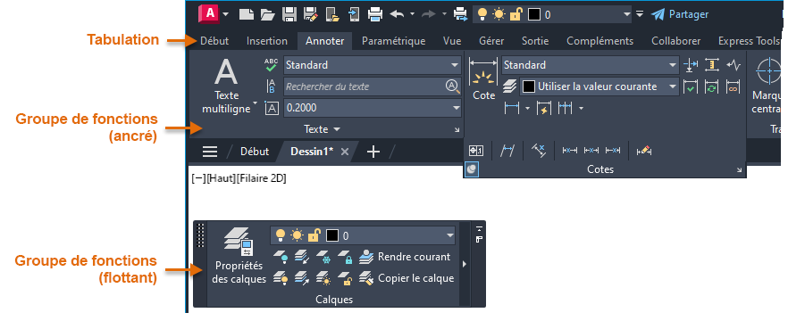 Le ruban est la zone principale de la fenêtre de l'application AutoCAD qui permet d'accéder aux outils utilisés pour créer et modifier les objets dans votre dessin. Chaque onglet du ruban peut être considéré comme un regroupement logique d'outils associés. Les groupes de fonctions d'un onglet du ruban permettent d'affiner chaque groupe logique.
