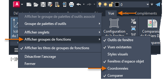 Une coche doit maintenant être placée devant l'onglet Coordonnées dans le menu, et le groupe de fonctions Coordonnées doit à présent s'afficher dans l'onglet Vue.