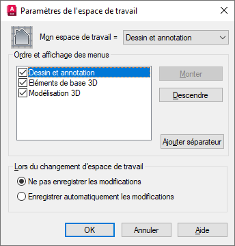 Un espace de travail permet de stocker l'état courant de l'interface utilisateur d'AutoCAD.