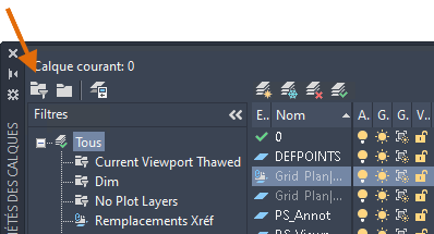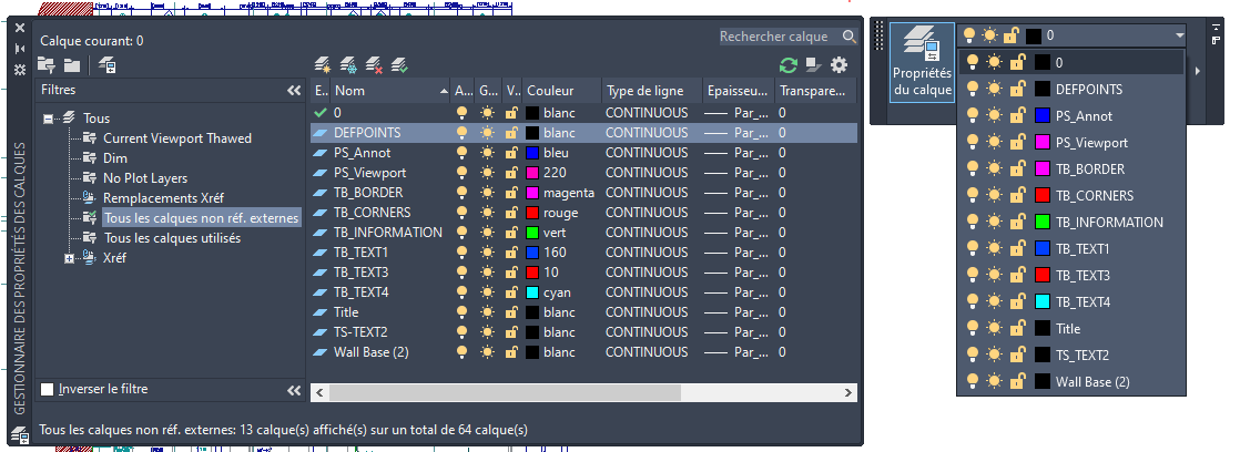 Pour définir les calques répertoriés, vous pouvez créer des filtres de calques. Par exemple, vous pouvez définir un filtre de calque excluant tous les calques associés à des Xréfs jointes de ceux répertoriés dans le gestionnaire de propriétés de calques et la liste déroulante des calques.