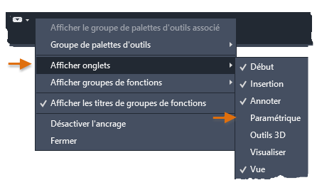 Vous pouvez agrandir votre espace de travail et simplifier l'interface utilisateur en masquant ou en supprimant les commandes rarement utilisées. Voici des options que vous pouvez prendre en compte si vous travaillez sur des dessins 2D.