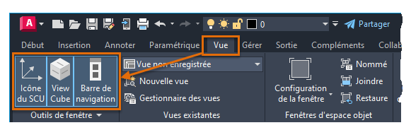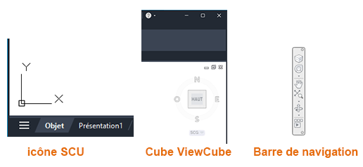 Le système de coordonnées utilisateur est utile dans certains dessins 2D, et il est essentiel pour la modélisation 3D. Si vous n'utilisez pas le SCU fréquemment, vous pouvez facilement le masquer. Il en est de même pour la commande ViewCube et la barre de navigation.