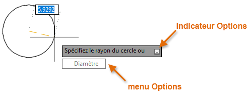 Cette icône indique que d’autres options sont disponibles. Lorsque vous êtes invité à indiquer un rayon, cliquez sur la flèche vers le bas ou appuyez sur la touche fléchée vers le bas pour afficher un menu avec l’option Diamètre. Si vous sélectionnez cette option, vous pourrez définir le cercle en spécifiant la valeur de son diamètre, plutôt que celle de son rayon. Lorsque le menu est affiché, vous pouvez vous déplacer parmi les options disponibles en appuyant sur les touches fléchées vers le bas et vers le haut ou à l’aide de votre dispositif de pointage.