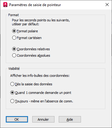 Les paramètres de saisie de pointeur ont un impact sur la façon dont les valeurs de coordonnées sont spécifiées lorsque la saisie dynamique est active. Cliquez sur Paramètres pour ouvrir la boîte de dialogue Paramètres de saisie de pointeur.