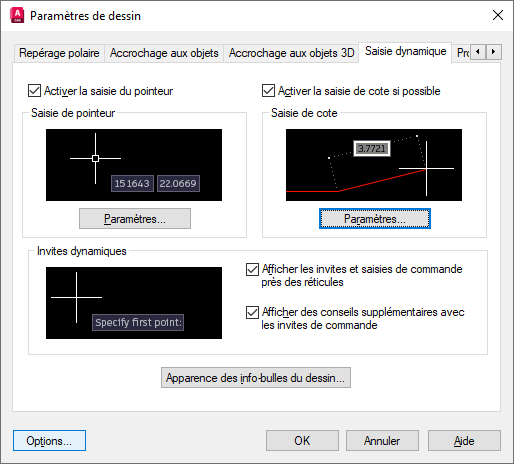 Les paramètres de l’onglet Saisie dynamique de la boîte de dialogue Paramètres de dessin sont les suivants :