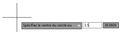 La valeur de coordonnées absolues 3.5,5 est utilisée comme centre du cercle. L’invite suivante de la commande CERCLE s’affiche dans l’info-bulle de saisie dynamique. Remarque : Au lieu d’appuyer sur la touche Entrée pour spécifier une valeur de coordonnées 2D, vous auriez pu taper une virgule, puis saisir la valeur de la coordonnée Z.