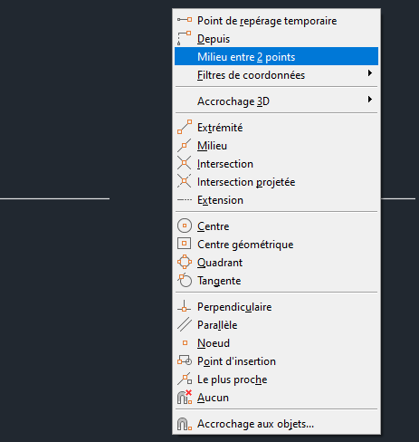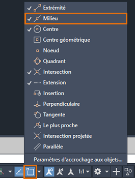 Dans le cadre de cet exercice, nous allons utiliser l’option d’accrochage aux objets de type Milieu. Assurez-vous que l’accrochage aux objets de type Milieu est activé.