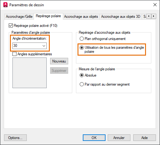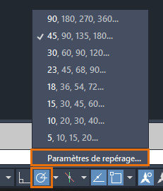 Vous pouvez également activer et désactiver l’accrochage aux objets à l’aide de la touche de raccourci F3, le repérage d’accrochage aux objets à l’aide de la touche de raccourci F11 et le repérage polaire à l’aide de la touche de raccourci F10.