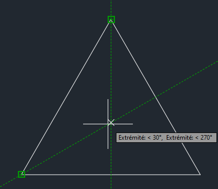 Par défaut, le repérage par accrochage aux objets effectue uniquement des pistes orthogonales. Toutefois, vous pouvez modifier les paramètres de repérage d’accrochage aux objets pour utiliser tous les paramètres d’angle polaire. Supposons que vous souhaitiez cette fois dessiner un cercle au centre de ce triangle à l’aide du repérage par accrochage aux objets.