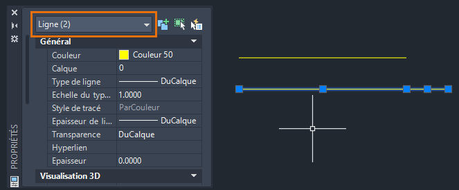 Ligne (2) s’affiche dans la liste déroulante Type d’objet située dans la partie supérieure de la palette Propriétés.