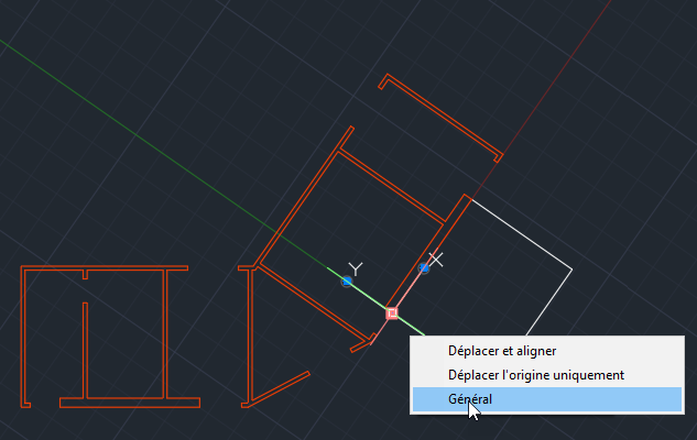 Une fois que le système de coordonnées utilisateur est aligné sur ces parois, vous pouvez souhaiter restaurer son état d'origine. Pour cela, vous pouvez sélectionner l’icône SCU, placer le curseur de la souris sur la poignée Déplacer, puis sélectionner l’option Général.