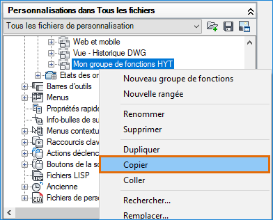 Sous le nœud Groupes de fonctions, cliquez avec le bouton droit de la souris sur Mon onglet HYT et choisissez Copier.