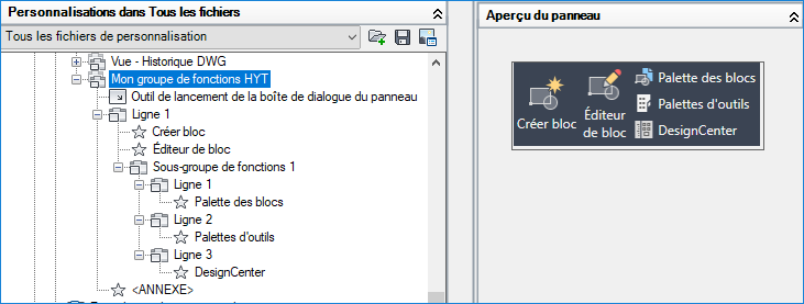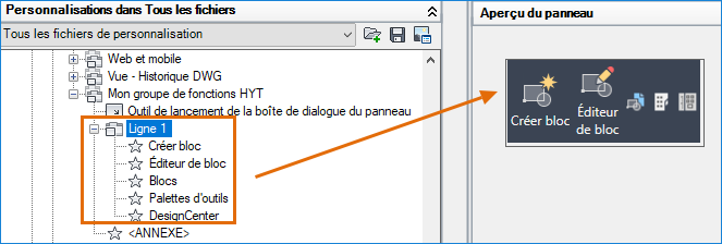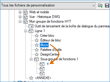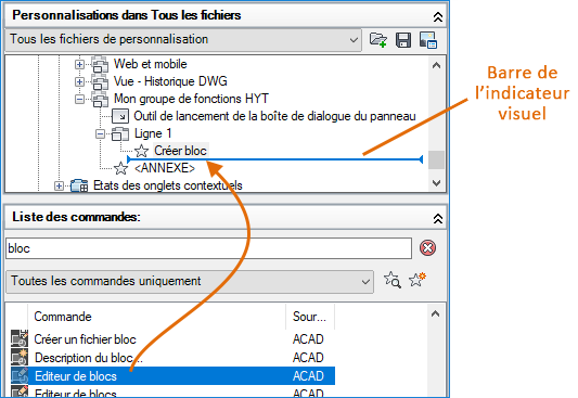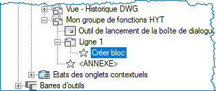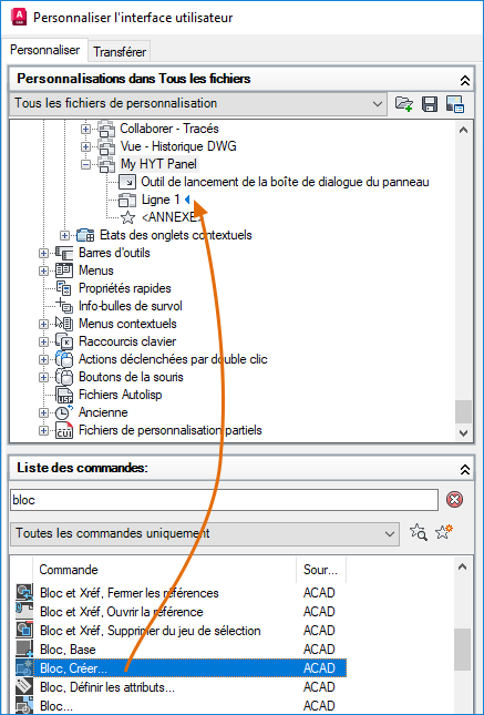 Dans la zone de texte Rechercher dans la liste de commandes, volet Liste des commandes, saisissez bloc. Sélectionnez Créer un bloc (commande BLOC) et faites-le glisser vers la ligne 1 sous Mon groupe de fonctions HYT.