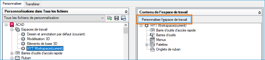 Sélectionnez l’espace de travail actif et cliquez sur Personnaliser l’espace de travail dans le volet Contenu de l’espace de travail.
