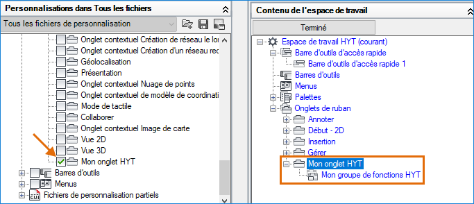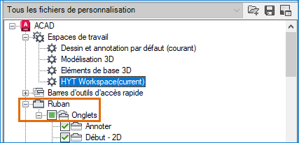 Les nouveaux onglets du ruban ne sont pas automatiquement ajoutés à un espace de travail. Les étapes suivantes expliquent comment ajouter Mon onglet HYT à l’espace de travail actif.