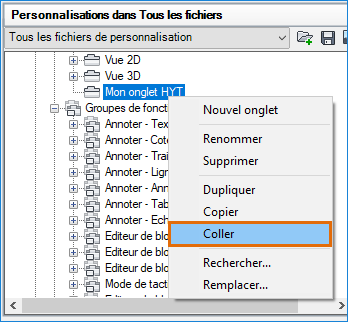 Sous le nœud Onglets, cliquez avec le bouton droit de la souris sur Mon onglet HYT et choisissez Coller.