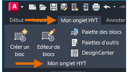 Dans cet exercice, vous allez ajouter cinq commandes de blocs au groupe de fonctions de ruban que vous venez de créer, Mon groupe de fonctions HYT.