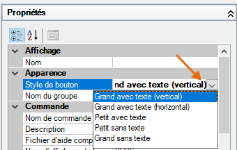 Dans le volet Propriétés, à droite, sous Apparence, cliquez sur la liste déroulante Style de bouton et choisissez Grand avec texte (vertical).