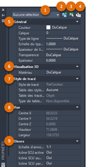 | 6 | Visualisation 3D | Affiche les propriétés de visualisation 3D du dessin ou de la sélection en cours. |