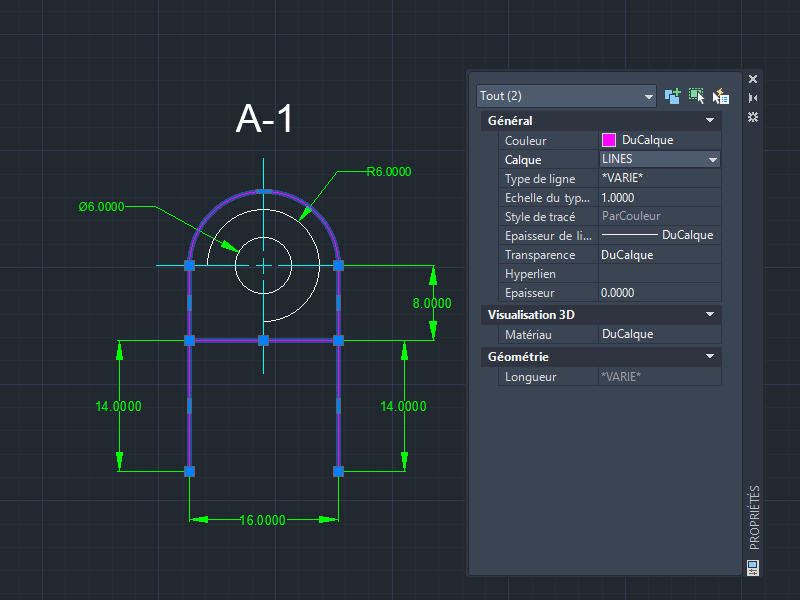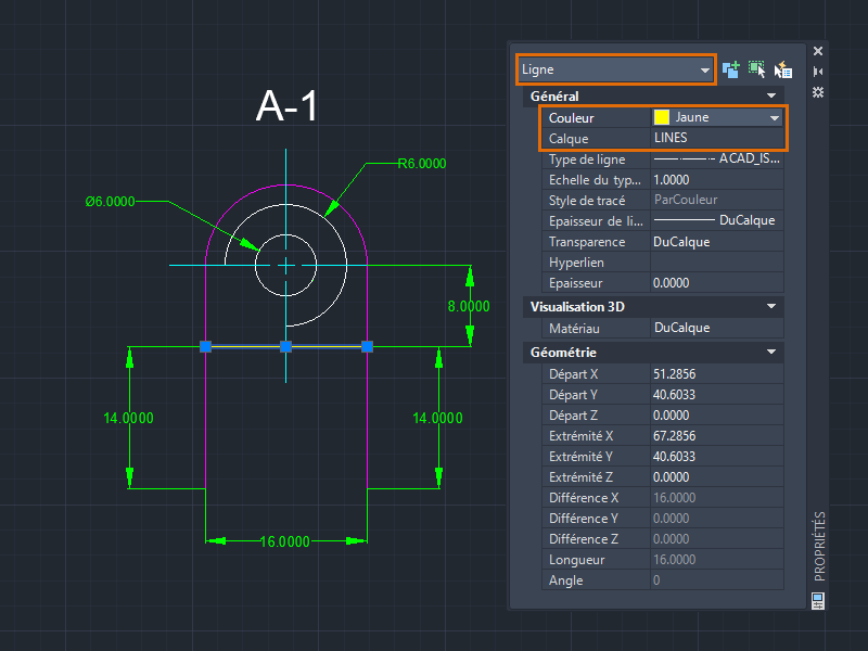 La modification d’une propriété des objets sélectionnés sur DuCalque hérite des valeurs de propriété du calque courant. La propriété de couleur des objets sélectionnés étant définie sur DuCalque, les objets affichent désormais la couleur définie pour le calque LIGNES.