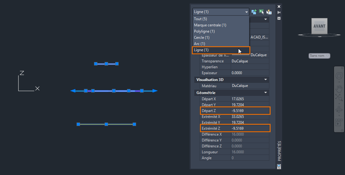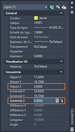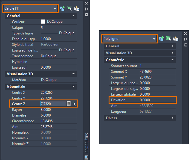 Les objets auront des noms de propriété d’axe Z différents. Un objet peut posséder une ou plusieurs des propriétés suivantes : Départ Z, Extrémité Z, Position Z (textmult), Centre Z (cercles) ou Élévation (polylignes).