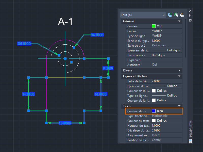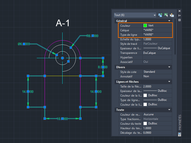 Bien que les cotes soient affichées avec la même couleur, vous pouvez voir que le calque et le type de ligne affectés aux cotes varient.