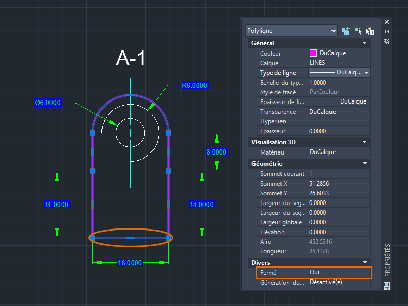 Il est parfois difficile de trouver et de corriger les petits espaces de contour, en particulier lorsque vous travaillez sur des dessins volumineux ou complexes. Ces espaces indésirables peuvent vous empêcher de créer les hachures souhaitées. La palette Propriétés vous permet de fermer (ou d’ouvrir) facilement des objets tels que des polylignes ou des splines.