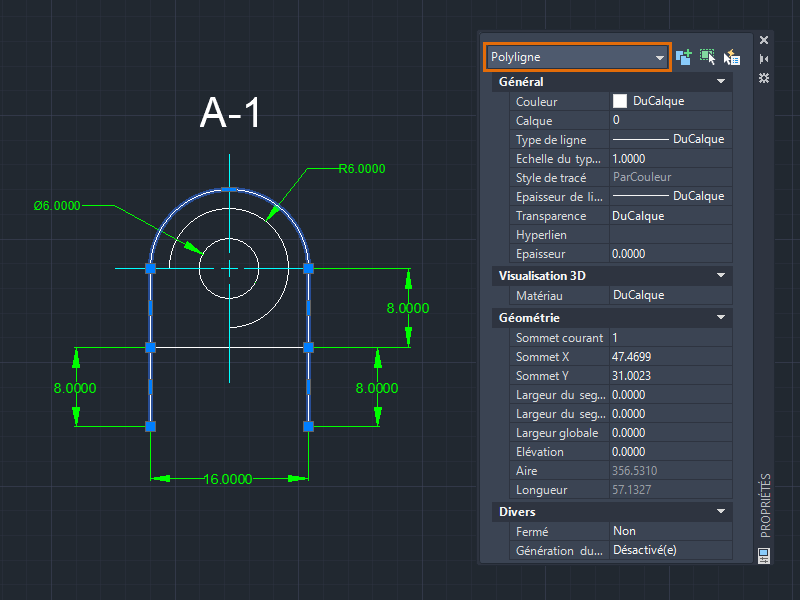 Notez que les propriétés disponibles pour la polyligne sont différentes de celles de la marque de centre.