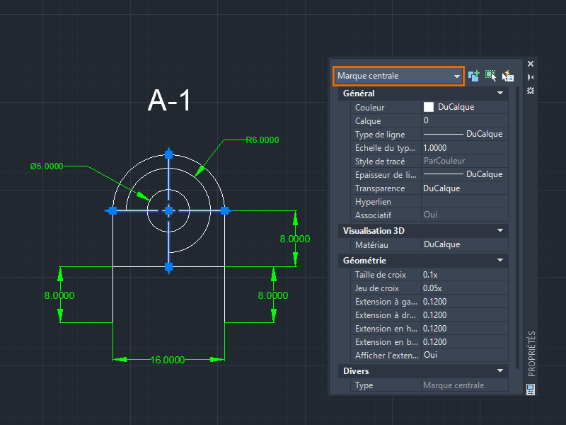 Les propriétés de la marque de centre sélectionnée s’affichent dans la palette Propriétés.