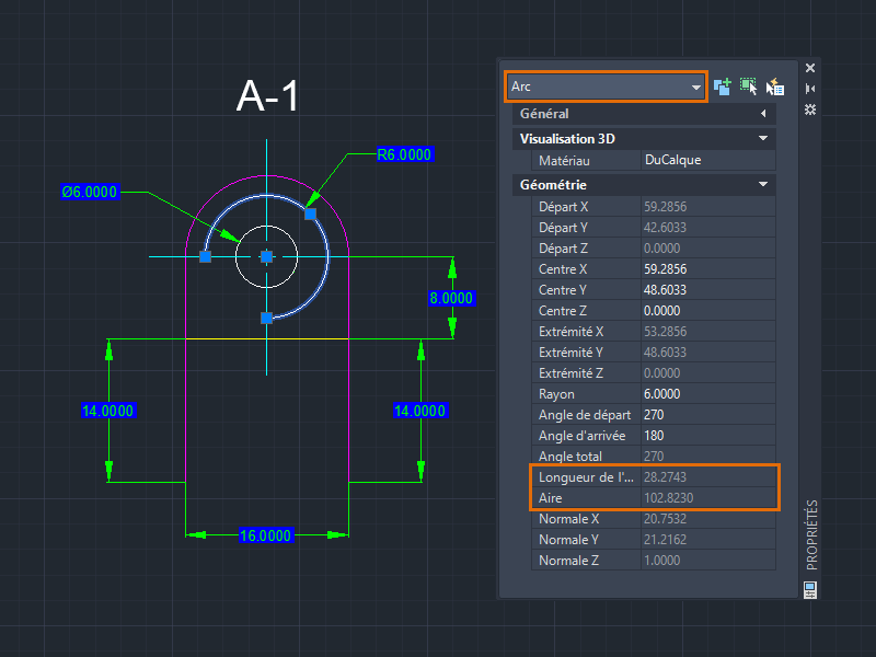 L’obtention d’informations géométriques peut être effectuée de nombreuses manières, par exemple à l’aide d’outils de cotation. Toutefois, selon la situation ou la complexité de la géométrie, il peut être plus facile de visualiser les propriétés d’un objet, puis de modifier les valeurs dans la palette Propriétés.