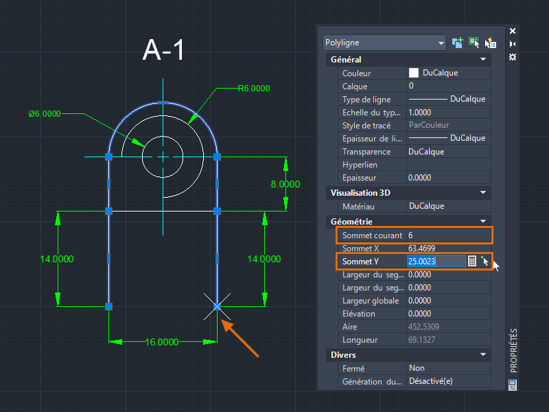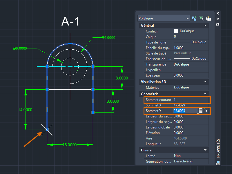 Les premiers et derniers sommets de la polyligne sont maintenant alignés. Cette méthode de modification des sommets est utile lorsque vous connaissez les coordonnées absolues souhaitées.