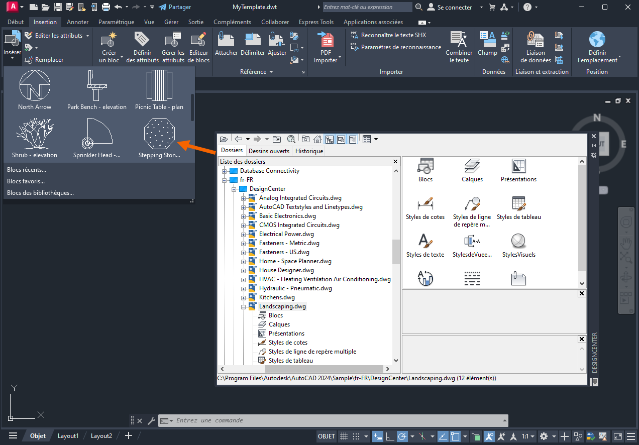 Désormais, les styles, blocs et paramètres de dessin nommés définis dans Landscaping.dwg sont disponibles dans MyTemplate.