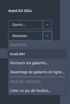 Autodesk propose plusieurs gabarits installés avec AutoCAD. Ces gabarits sont accessibles à partir de l’onglet Début de la liste déroulante Gabarits.