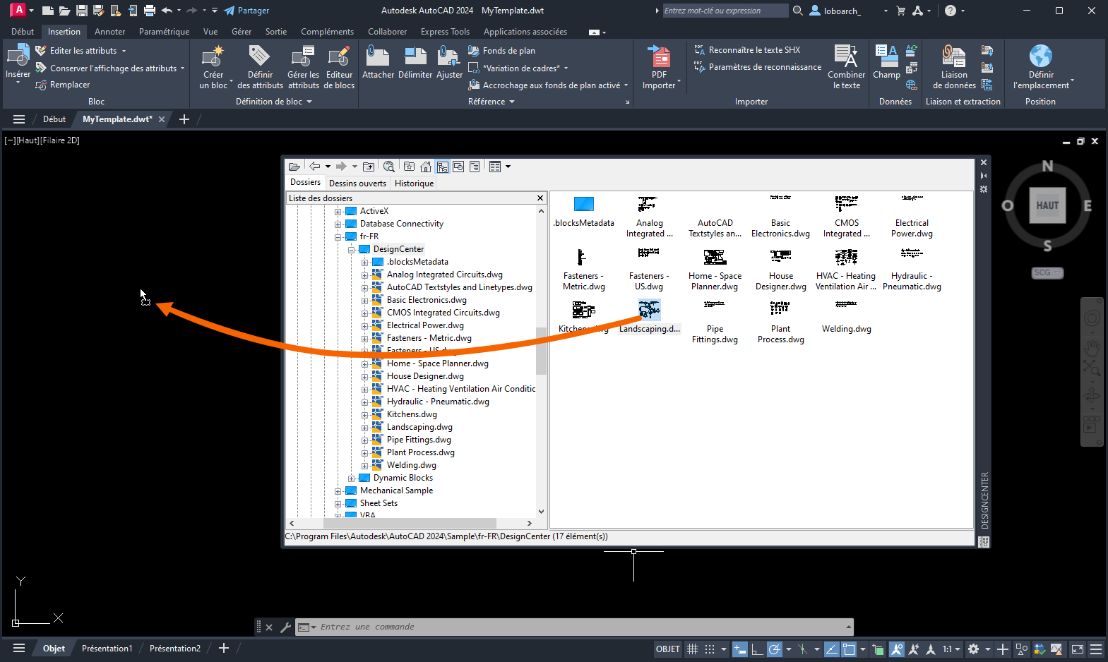 Créez un dessin pour tester MyTemplate et vérifiez que les blocs sont disponibles dans le nouveau dessin.
