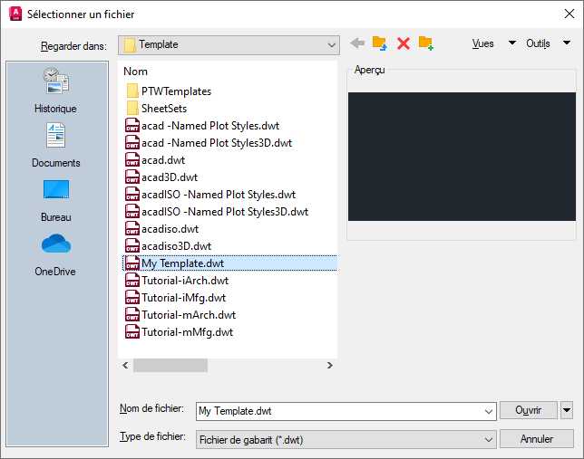 Désormais, lorsque vous commencez un nouveau dessin, AutoCAD utilise MyTemplate.